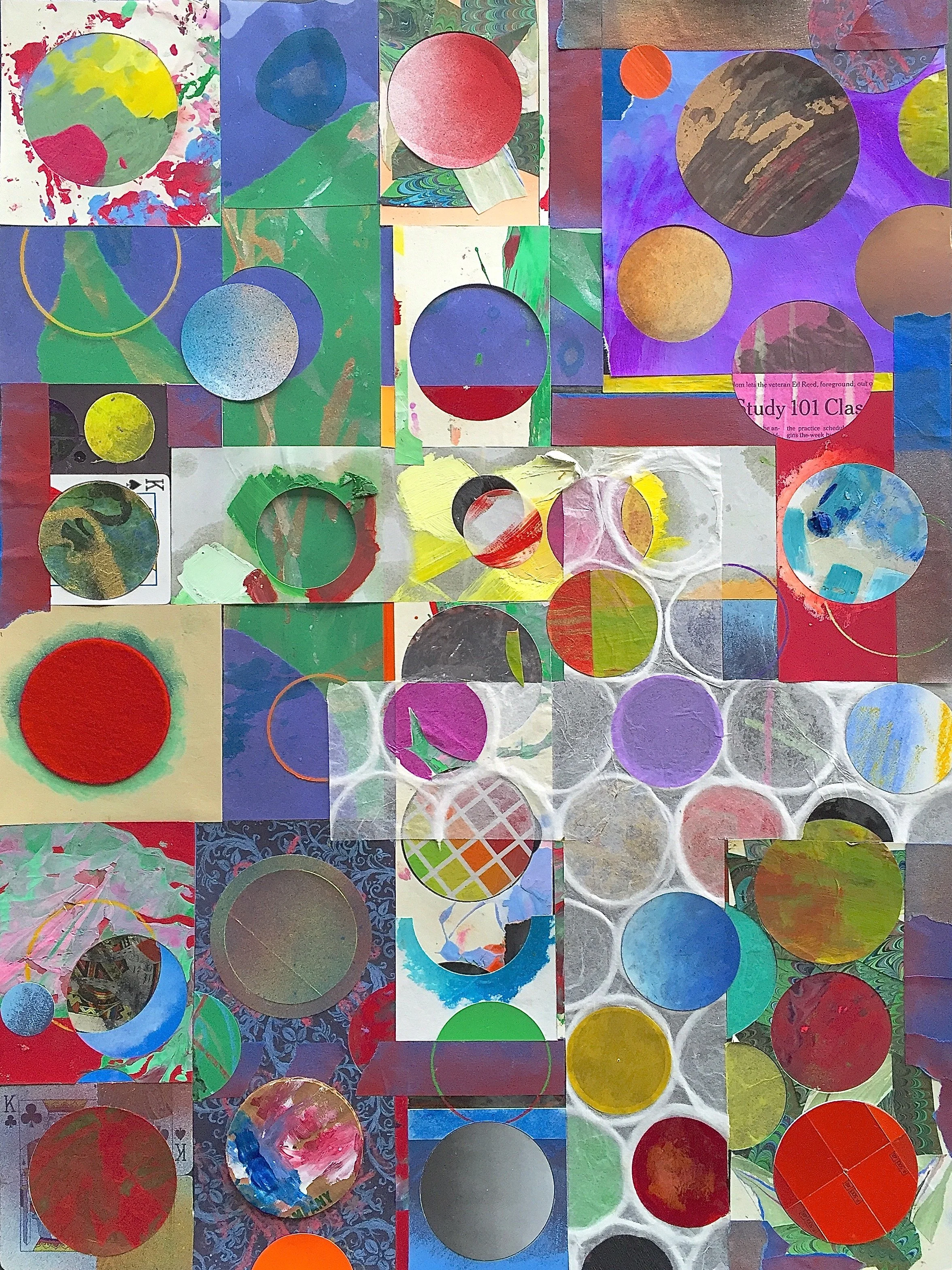 It was, as things turned out, difficult to stop. There were still an abundance of ideas and materials to consider. I decided I would complete one more piece. In it, three crosses of different materials overlap and are integrated into a world composed of positive and negative, circles. There is plenty of vibrant color and shape relationship to explore and get lost in. The obvious was unintentional and quite a surprise.