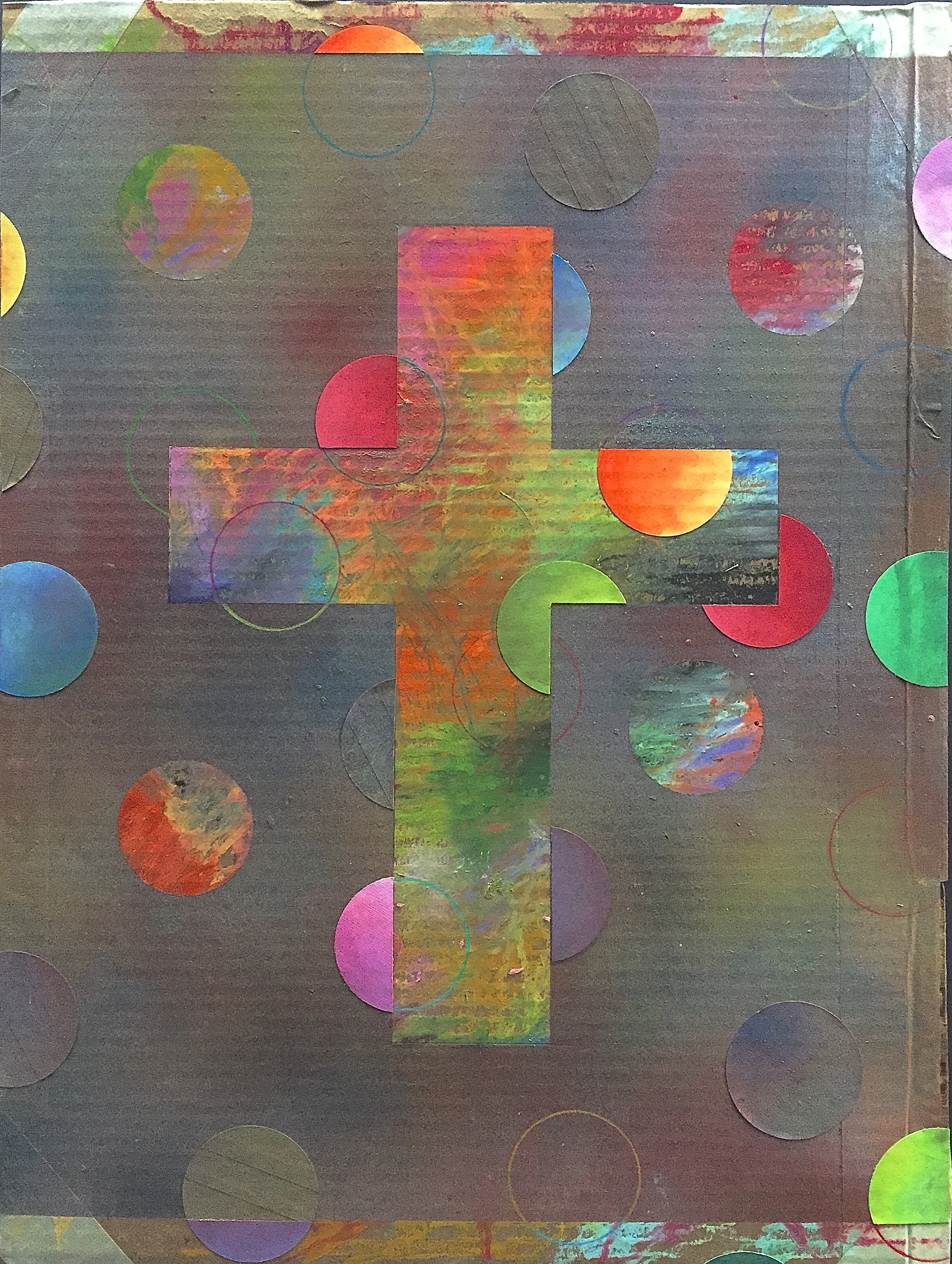 The old piece of cardboard became an interesting surface for drawing with the oil pastels and then masking off sections and layering on spray paint. The color and texture that was created reminded me of graffiti. The spray paint formed interesting gradations of color that contrasted nicely with the more vibrant color of the oil pastel. The circles float on an eerie background intersecting with the cross in mysterious ways. The texture of the cardboard remains obvious.