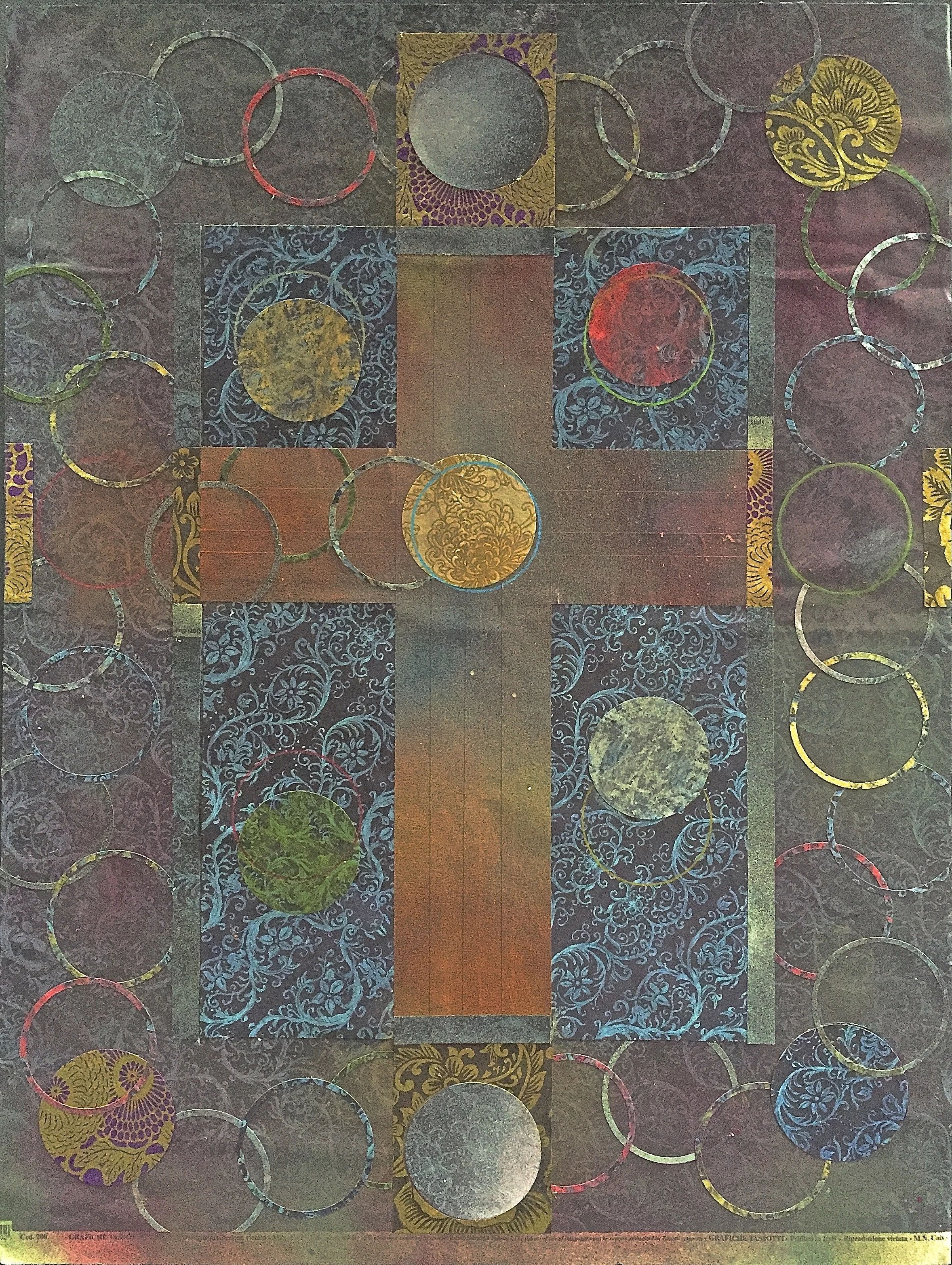 I was working with this fancy blue patterned paper and using spray paint to diminish the power of the pattern. I also had a collection of circular rings that I had cut and saved and decided to create a chain. The spray painted masking tape, when assembled as a cross, became an entirely different material. The touches of the fancy patterned paper add elegance. Quite by surprise, the final piece had a nineteenth century Far Eastern feel to it.