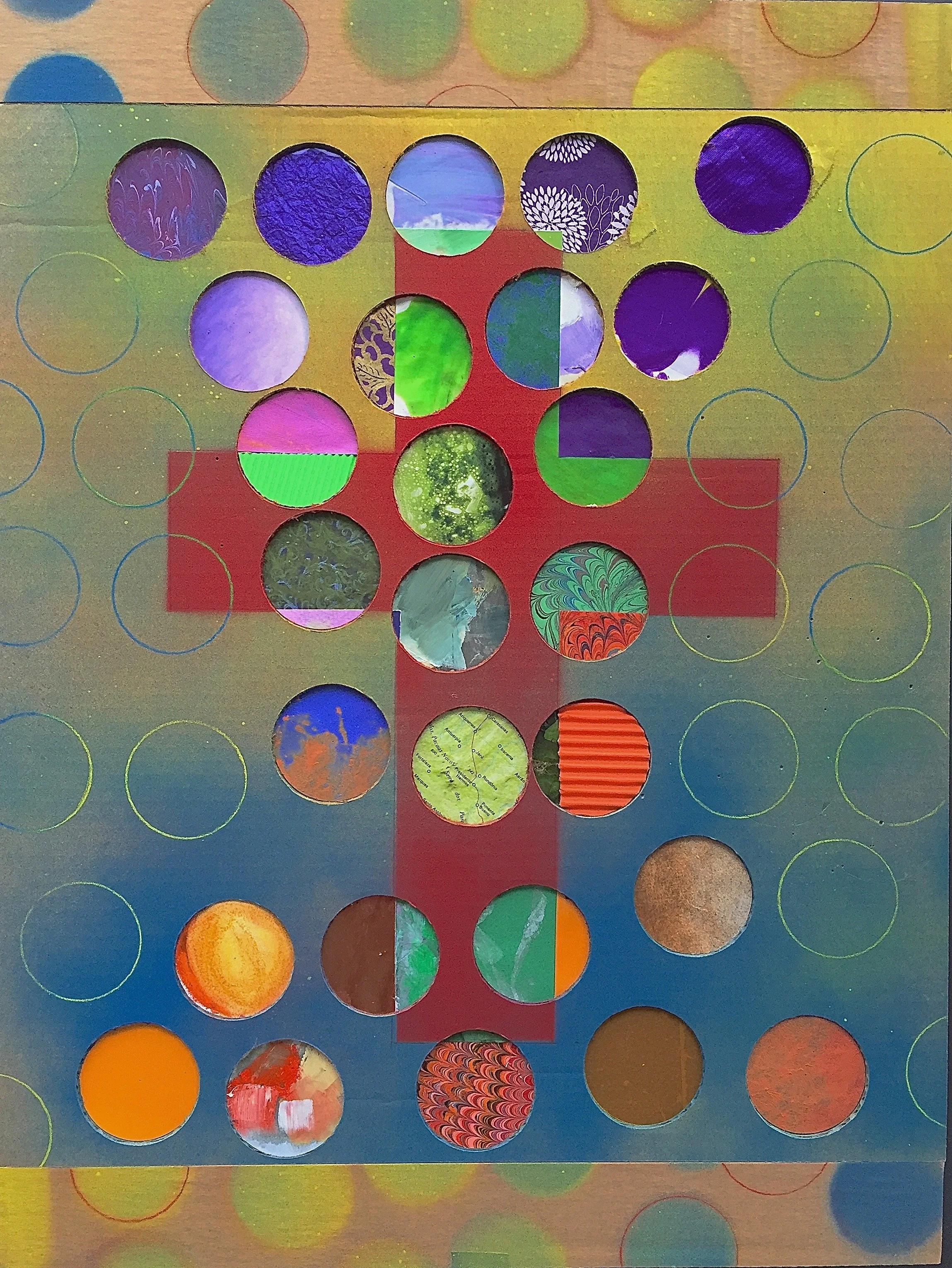 The complementary colors were always intriguing to me and I kept challenging myself to create new opportunities to work with them. This piece of cardboard, with the negative shapes from Jeweled Cross, became a great starting point for Green Cross, which is hidden behind the spray painted red cross. The circular holes become interesting opportunities to experiment with color and texture.