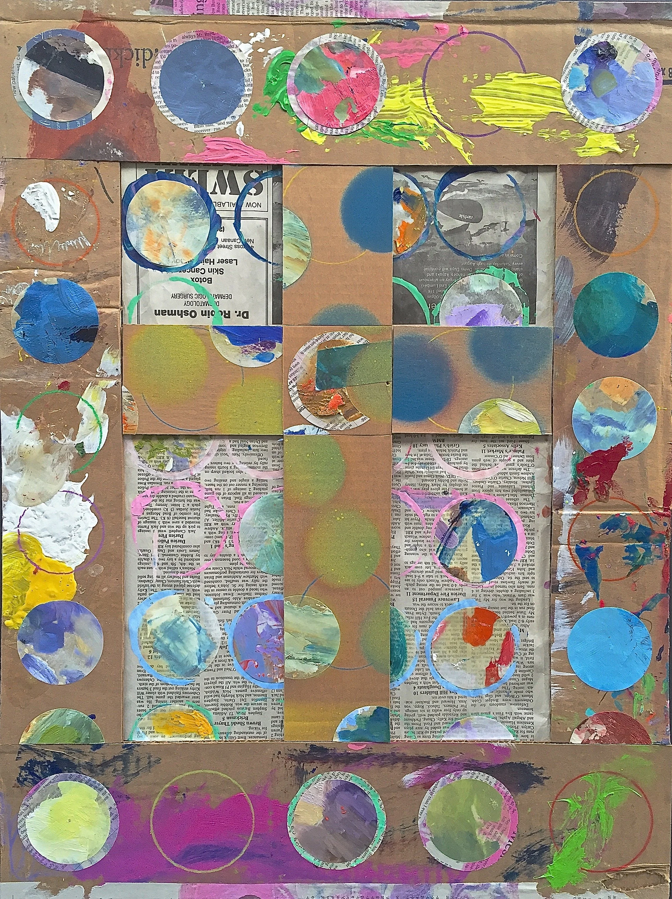 There were always a variety of materials around the studio that I was waiting to use. It was sometimes hard to get around to all of them. This collage was inspired by a piece of newspaper patterned with circles of tempera paint. The painted scraps of cardboard became an interesting border upon which to apply the rows of circles. Overall, the variety of circular shapes holds the piece together.