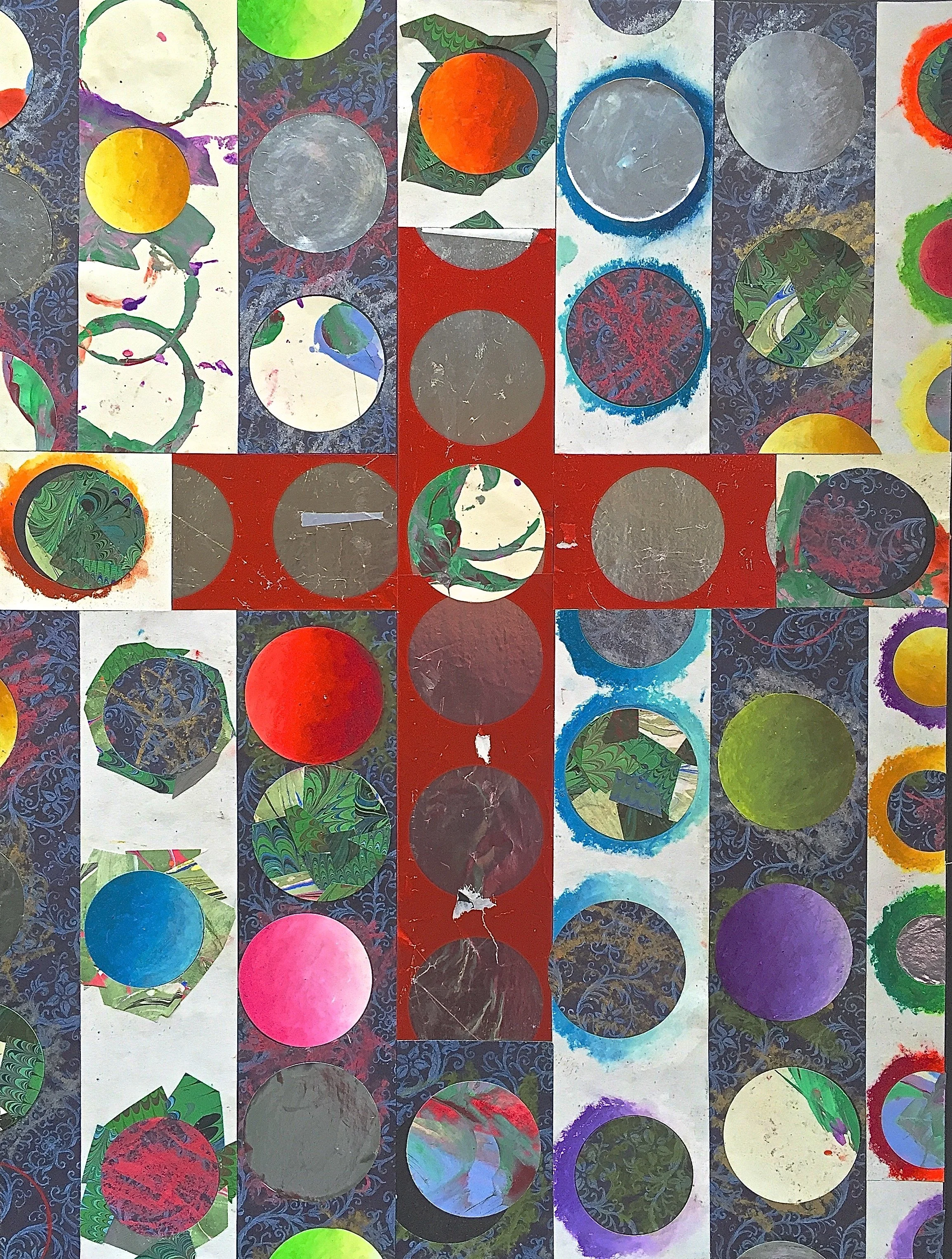 Christmas Cross gets its name from the recycled holiday wrapping paper used to create the cross. The remainder of the piece is composed of scraps from other collages in the series. The pattern in the cross is repeated in the background but without the same sense of order. The cross projects stability while everything around it appears to be in motion. The color keeps the stripes from overpowering.