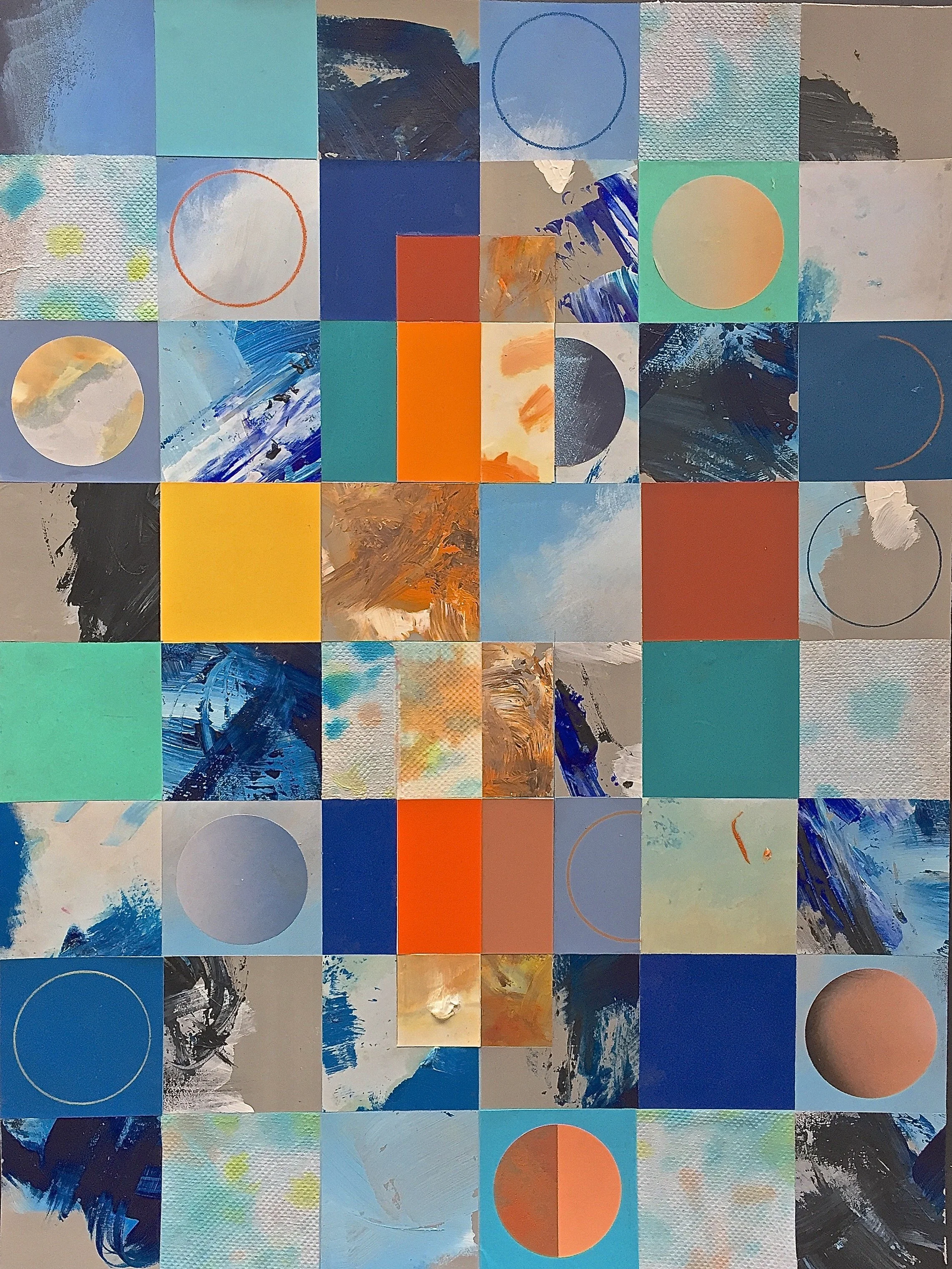 This piece revisits the checkerboard concept in blues and oranges. The theme of sunrise and sunset was on my mind. The cross, which appears very subtle, represents the rising sun with all of the associated colors. The various blues are suggestive of all the hours of the day and night. It is a happy piece, as well as an intense study of complementary color.