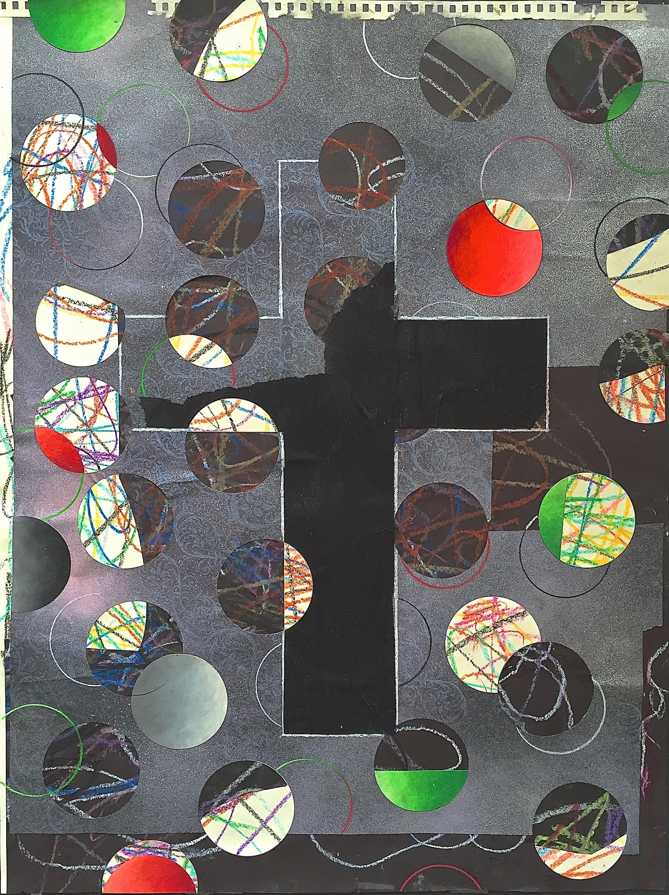 The black crepe Funeral Cross floats on a background of circles representing life. There is a lot of mystery about the way things overlap, emerge from behind and move off the edges. I was working on layering various random larger scraps on top of each other and then experimenting with circles in the positive and negative space. The cross appears to be deteriorating with age.
